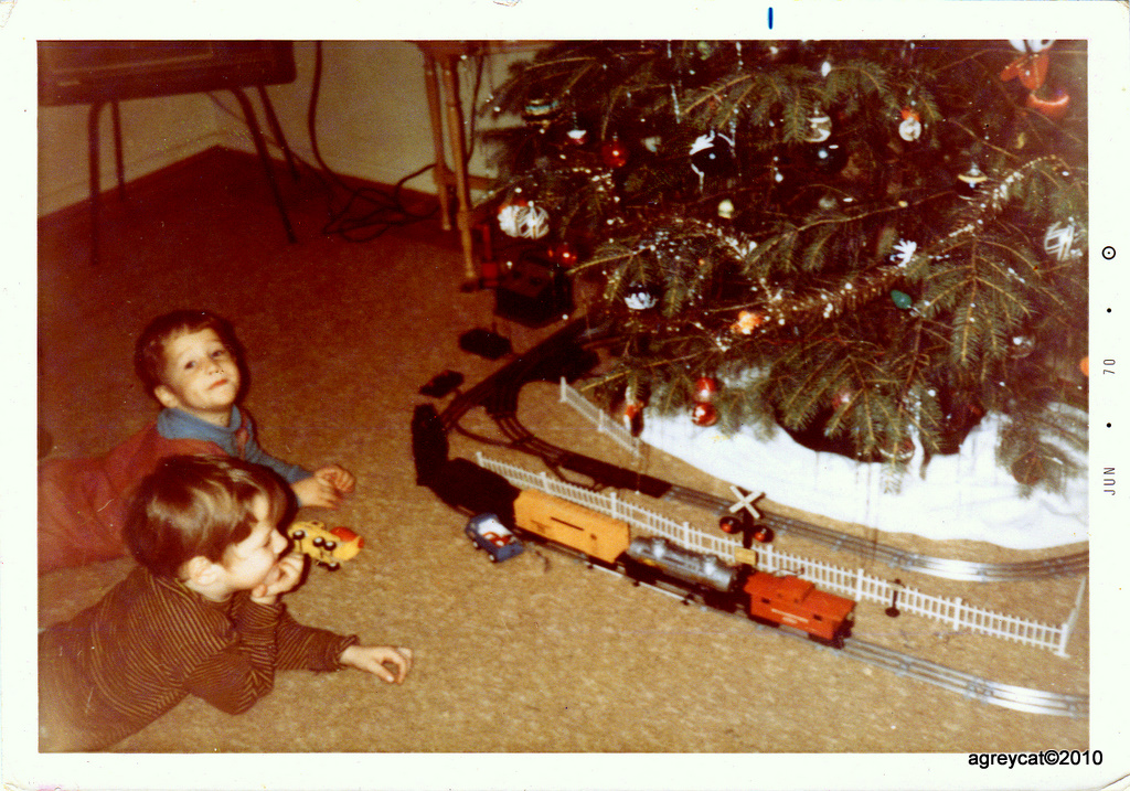 Warmth, love, family, excitement, wonder, and innocence are the thoughts that popped into my head as I looked at this picture. Me and my brother watching dads Lionel train puff out smoke as it did circles under the Christmas tree. I was almost 5 and my brother would have been 3. What a wonderful childhood we had!