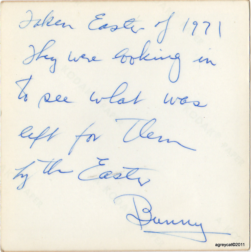 My brother and I were lucky. We always got two Easter baskets. We got one from the Easter Bunny at home, and then we’d go to our Grandmothers house down the road, and get another. That E. B. was better than Santa. I remember standing outside her front door, she had always set the stage, theater of the mind so to speak. There were convincing muddy foot prints on the front door, and grass trails that led us more or less straight to our baskets. One year there were raisins outside meant to look like bunny crap. I’m pretty sure they were raisins.