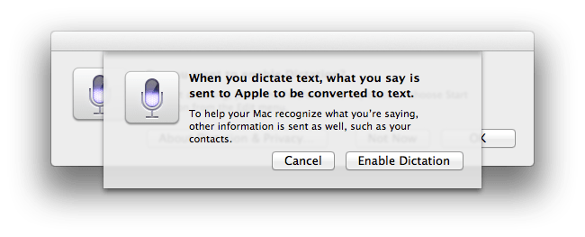 Recently I had the good fortune to purchase a 6 month old Macbook Pro. It’s awesome! And fast! Everyday I’m learning more and loving it. That is until I decided to try the dictation app. This is the window that came up:
